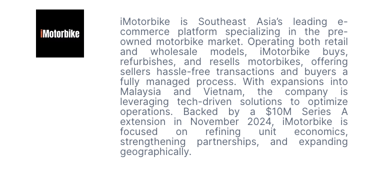 Gil founded iMotorbike in 2016, initially a motorbike-focused news portal and classifieds platform in Kuala Lumpur. The company quickly became Southeast Asia’s leading online marketplace for motorbike dealers, raising $850K in early funding. In 2021, iMotorbike pivoted to directly buying and selling motorbikes, meeting growing demand in the preowned market. With significant expansion, the company opened its first store, entered the Vietnamese market, and launched innovative solutions to improve operations.
